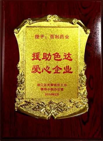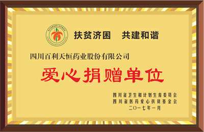 2016年和2017年,向四川省医药爱心扶贫基金会首批医疗爱心救助项目捐赠,荣获“爱心捐赠单位”称号。
