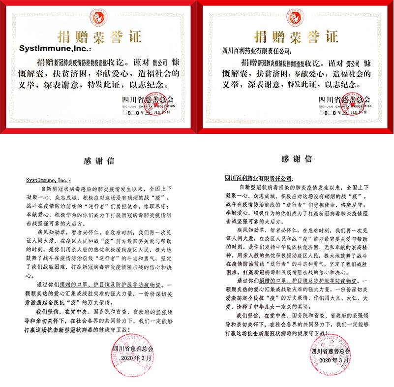 金年汇官方版网站登录入口-金年汇(中国)携手美国西雅图免疫,中美企业共同通过四川慈善总会,向四川和湖北等一线医院分批次捐赠医用外科口罩和N95口罩、护目镜、防护服等防护用品。向全国几十家医院捐赠抗病毒药物新博林(利巴韦林颗粒)和提高免疫的好好黄芪颗粒等,助力一线医护抗疫